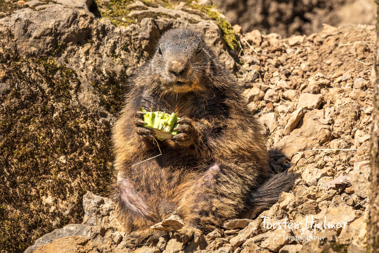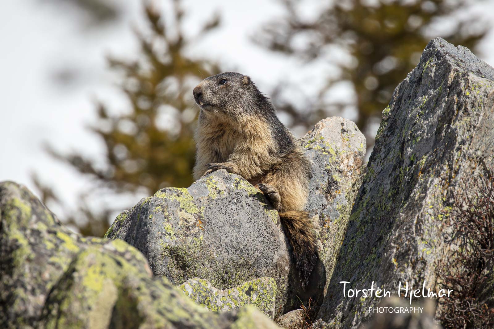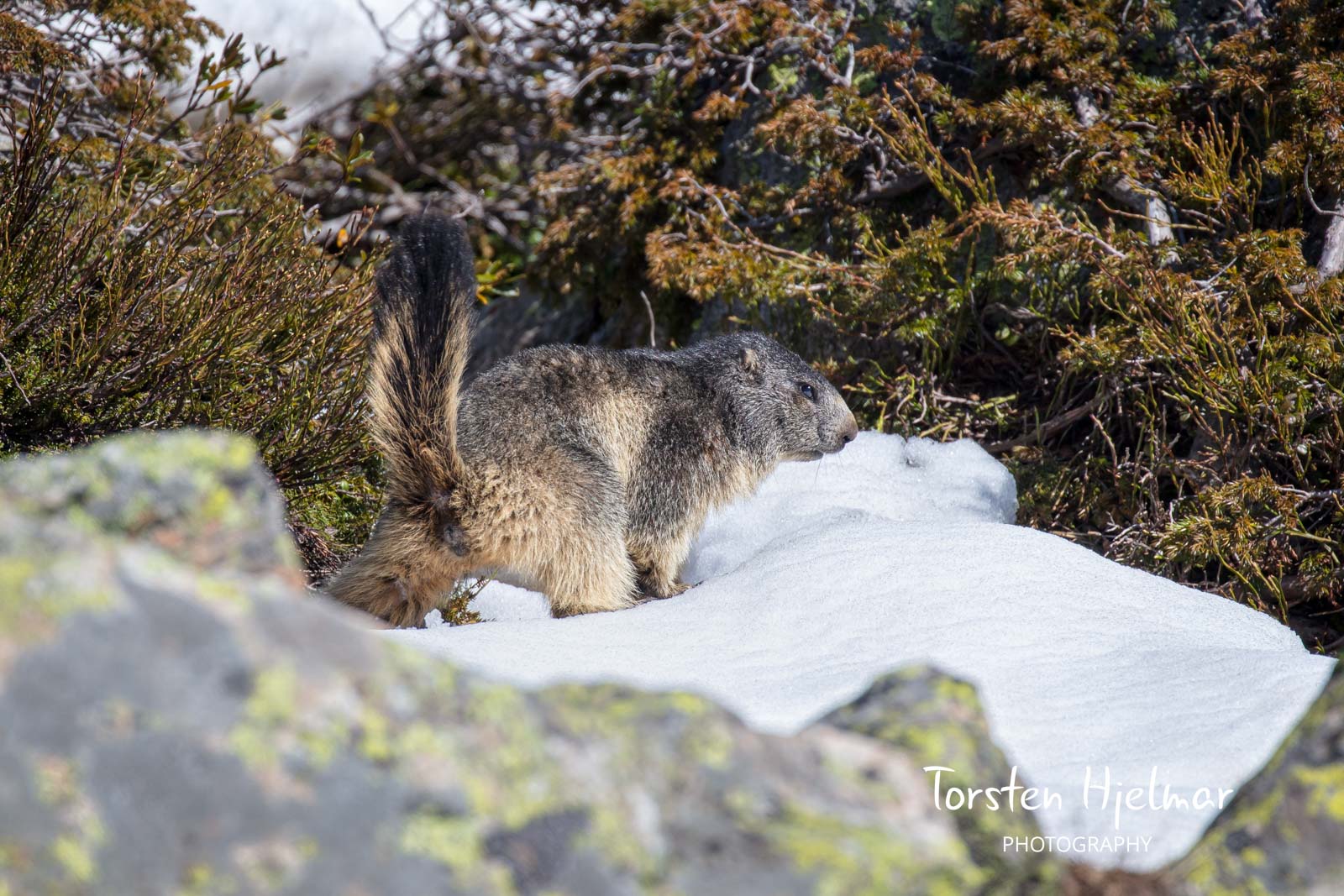 The alpine marmot (Marmota marmota) is a large ground squirrel, that originated during the last cold period of Earth and is adapted to the ice-age climate. The alpine marmot since has persisted in the high altitude meadow, and live in heights between 800 and 3,200 m in the Alps and other European mountain regions. They spend up to nine month in hibernation.