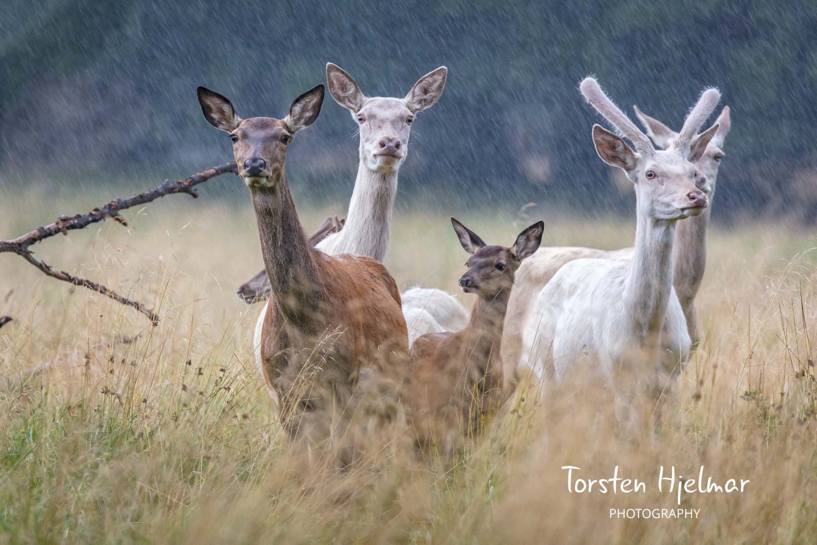 The young fallow deer, known as fawn, can be totally white. These are not albinos, as evident from their dark eyes and nose. Here they are looking out at what is happening there...